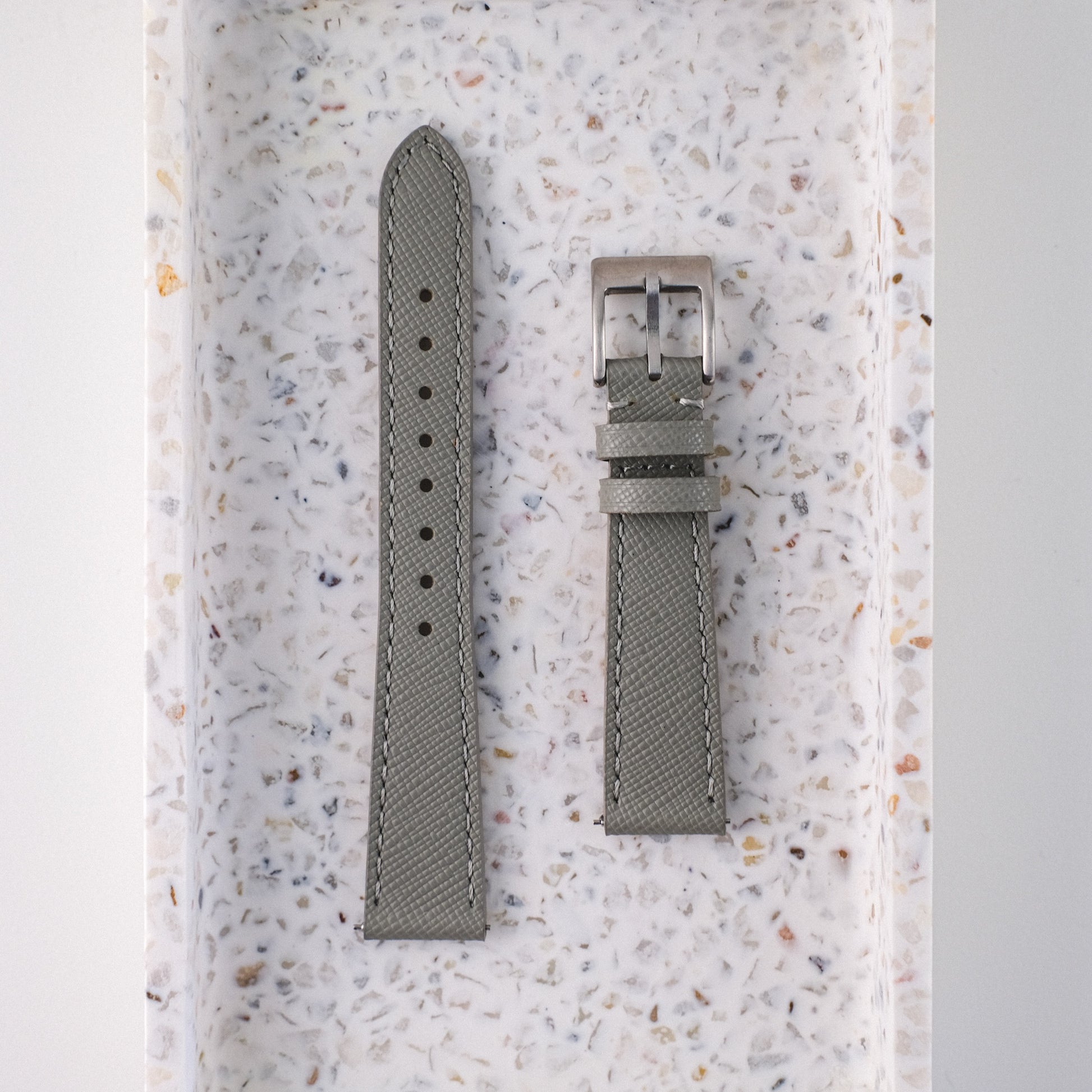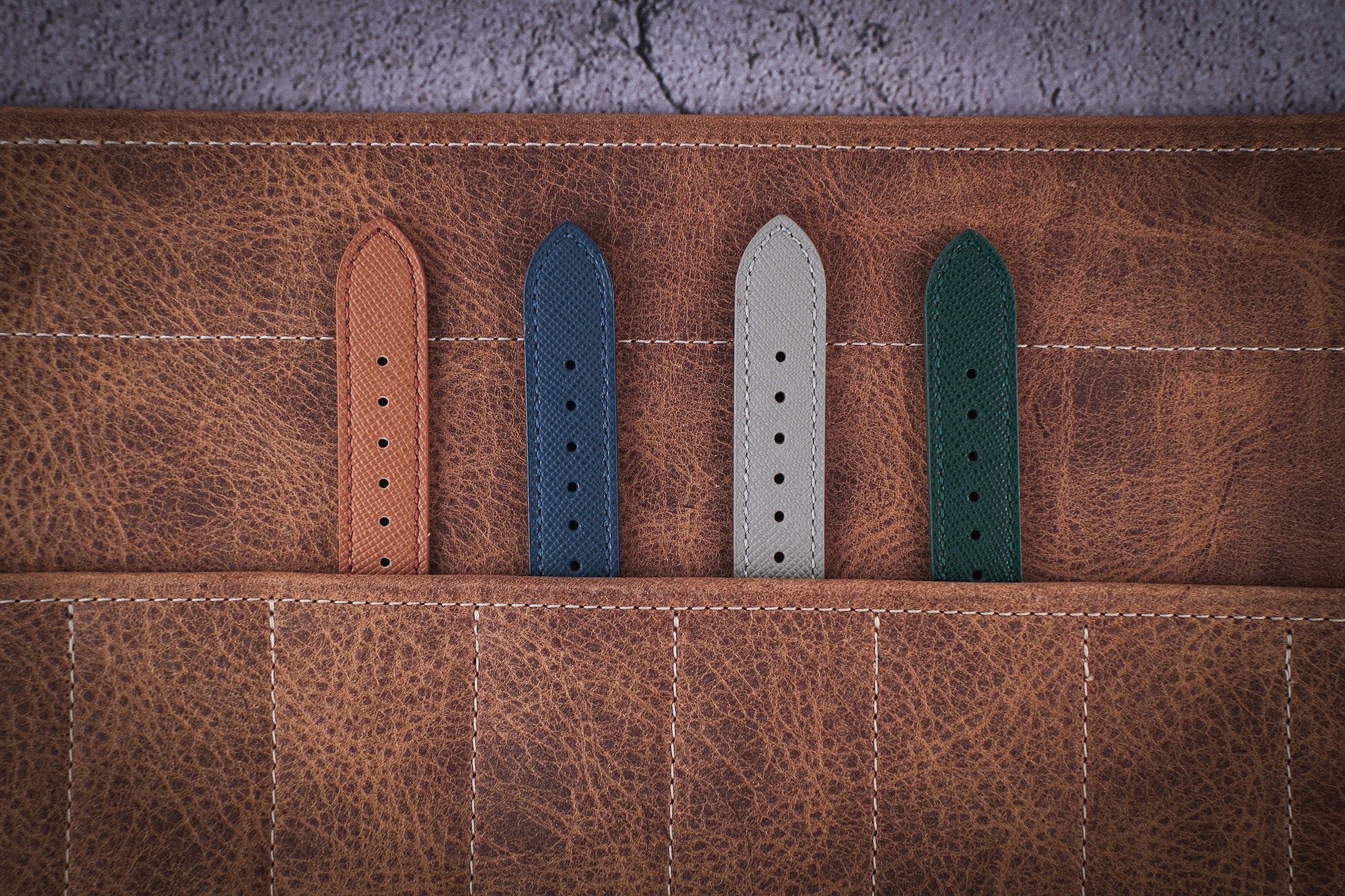 Our Saffiano leather straps feature a distinctive crosshatch texture with a refined, structured feel, complemented by precise tonal stitching. The underside is crafted from water- and sweat-resistant leather to ensure comfort and durability throughout the day. Available in four timeless colors—Sterling Grey, Cognac (brown), Harbor (blue), and Forest Green—these straps combine everyday reliability with sophisticated style.